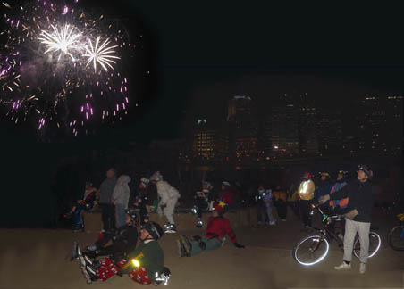 FireworksNear The Point in Pittsburgh PA (the junction of the rivers) Each year Pittsburgh kicks off the December holiday season with “Light-Up Night”. There’s a party downtown, all the building owners are encouraged to leave their lights on for the evening, and fireworks close the party. The bicyclists hold a ride around the area, principally on trails; they come with lights and reflectors. Similarly, the rollerbladers have a trip around town; they come in lights and costumes. We wind up at the same place on the trail, across from The Point, to watch the fireworks.