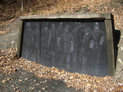 Ghosts on the Ghost TownAcid mine restoration area across Blacklick Creek from Vintondale The Ghost Town Trail passes through several areas that were devastated by coal mining. One of the most extensive of these areas is under restoration, featuring art installations as part of the restoration. An entry to a deep mine beside the trail formerly drained from this mine entrance. When the entrance was sealed, this ghostly reminder of the miners was installed at the entrance. |