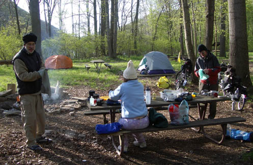 Trailside CookingRoundbottom Campground, between Dawson PA and Layton PA The Great Allegheny Passage, together with the C&O Canal Towpath, provides one of the greatest bicycle camping tour in the east. Both have free trailside campgrounds with picnic tables, water, toilet, river access, and room to set up tents. Here you can also see the Adirondack-style shelter provided at some of the campsites along the Great Allegheny Passage. |