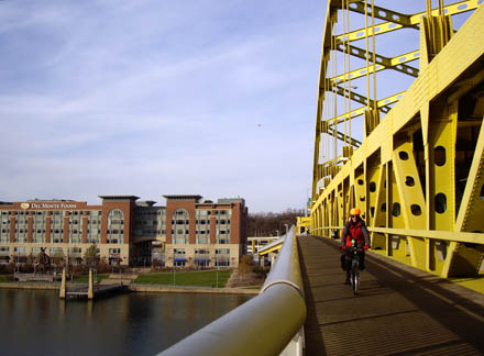 Hot Metal BridgeThree Rivers Heritage segment of Great Allegheny Passage, Pittsburgh PA Two near-identical railroad bridges share a single set of piers. The Monongahela Connecting RR bridge on the left once carried general rail traffic and was converted for vehicle use. The Hot Metal Bridge on the right was used to shuttle hot metal from the Pittsburgh Works furnaces to the South Side Works rolling mills; it was converted for bike/ped use. Because of the strategic concentration of rail traffic and steel production, this pair of bridges was the nations’ highest-priority bridge for protection from enemy attack during World War II. |