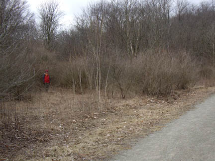 Here's the view from the trail. The path toward Roy (in the red jacket) is the old railroad grade, and it is elevated about 20 feet above the surrounding terrain. It leads to the back side of the possible camping area, which is inside the triangle of the "Y" (not on the RR grade proper, which is full of old ties). The houses on the opposite side of the trail are not visible from the potential camping area.