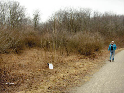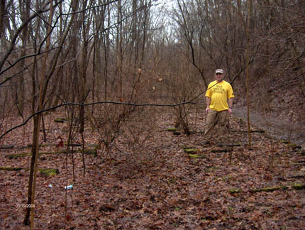 | Charlie on the trail, and where the clipboard is sitting would be one possible entrance to the campsite, or is could be the actual campsite if it is located right along the trail. | Roy is starting down the trail that follows the RR alignment. To reach the area of the second panorama above, go back 30-50 feet and turn right, toward the trail. (this image is part of the first pan above) |