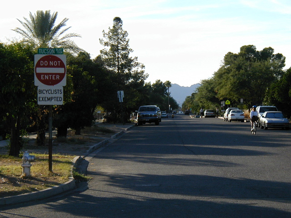 A bicycle route parallels a busy road. To keep the bike route off the busy road, it goes counter-flow on a street that's one-way during rush hour.