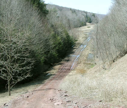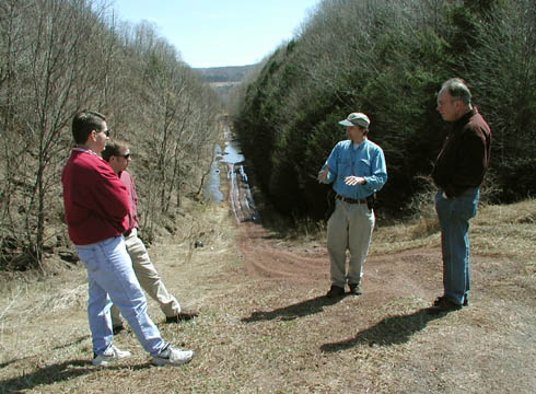 Shirley Hollow embankment, looking east at the Continental Divide as Jim explains how the Atlantic drainage is winning over the Mississipi drainage... |