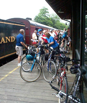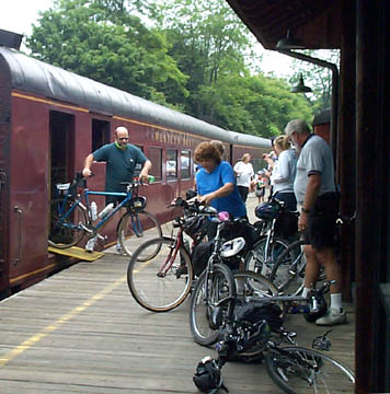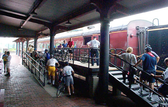 This is the day of transition between the C&O Canal Towpath and the Great Allegheny Passage. We begin at the Western Maryland Station in Cumberland, which is the terminus of the C&O Canal and the zero milepost for the Great Allegheny Passage. Since the latter trail will run alongside the Western Maryland Scenic RR, we take the steam train to Frosburg. At that point we catch a shuttle around the unfinished part of the trail, resuming in Meyersdale.
